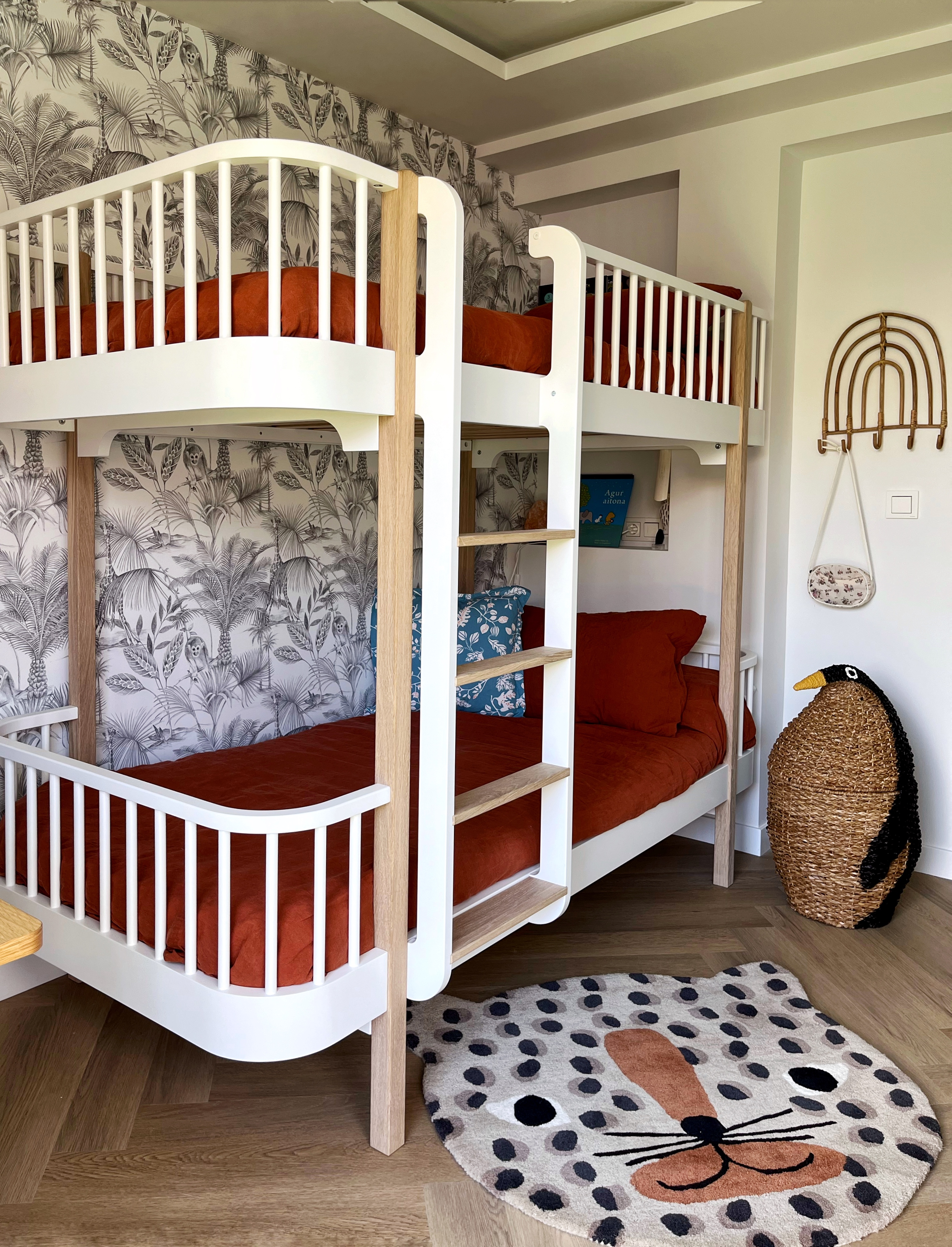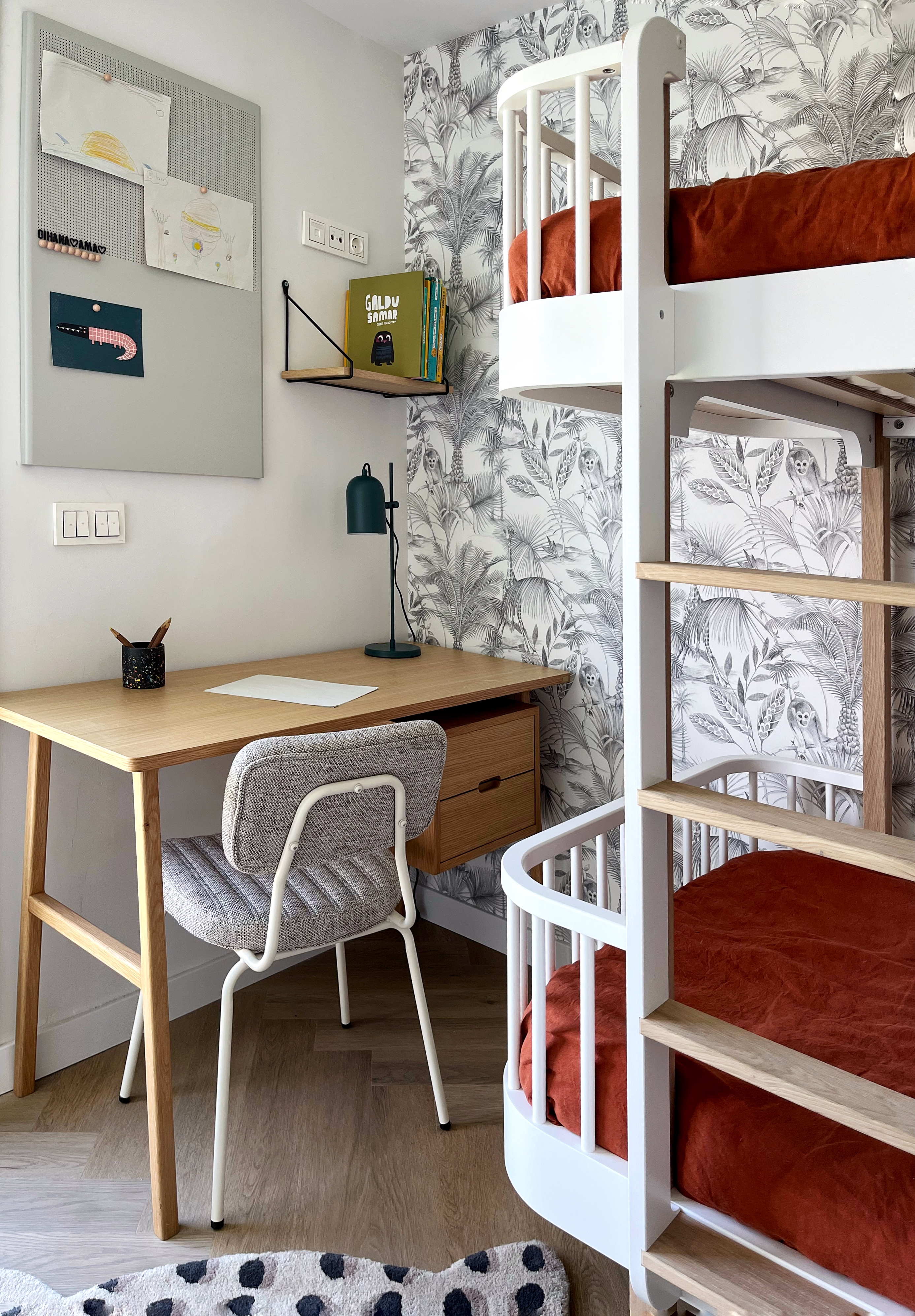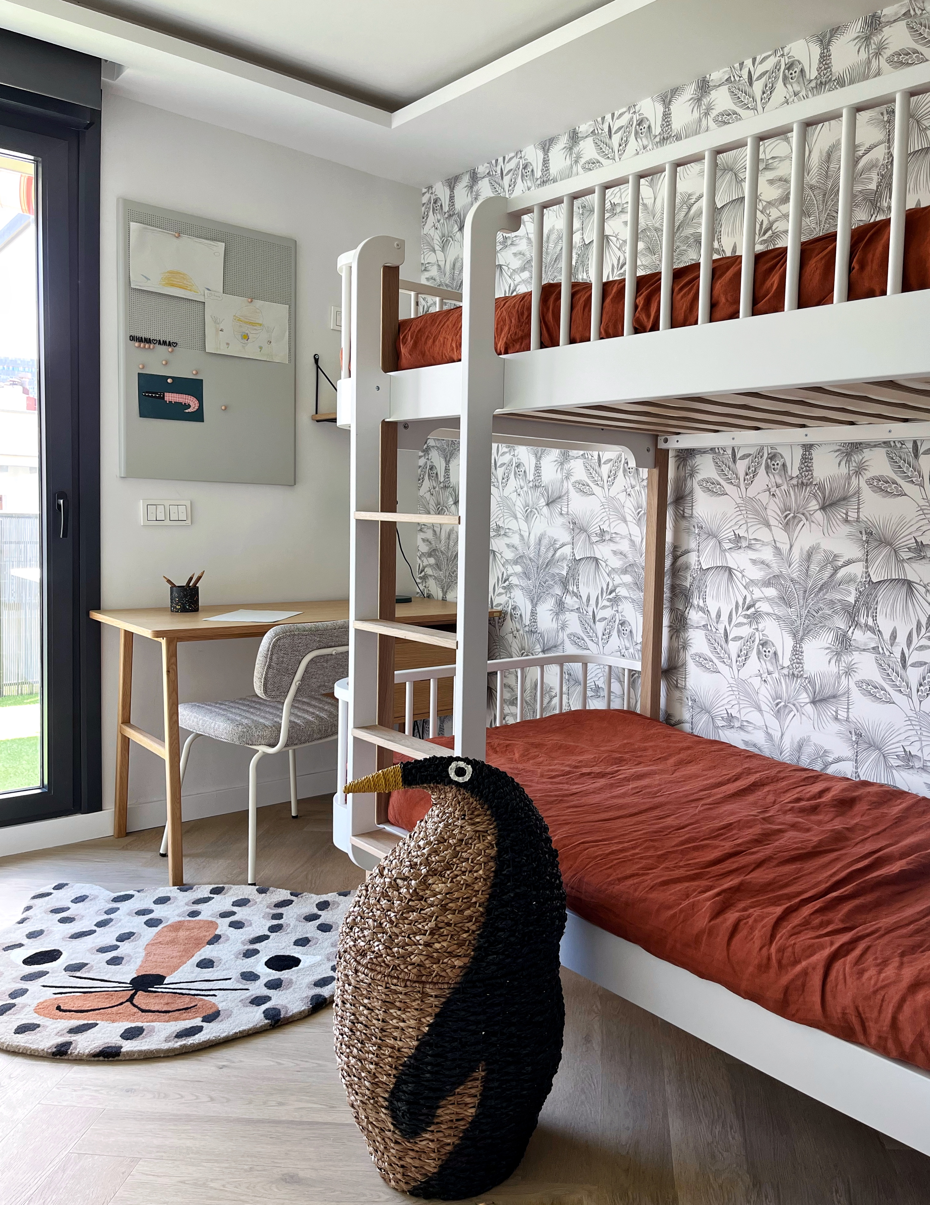 Nos encontramos con una habitación de 9,78m2, alargada y con un armario de obra que condicionaba la distribución. Ohiana, de 7 añitos, tenía muy claro que quería tener una litera en su habitación y en la preciosa colección de Oliver Furniture, firma escandinava del alta calidad de la cual somos distribuidores, encontramos la litera perfecta para no cargar este pequeño espacio.