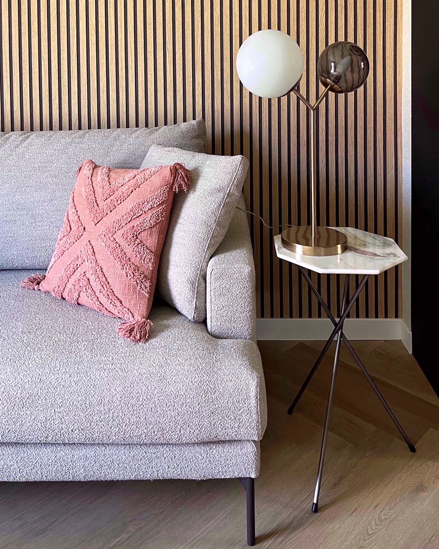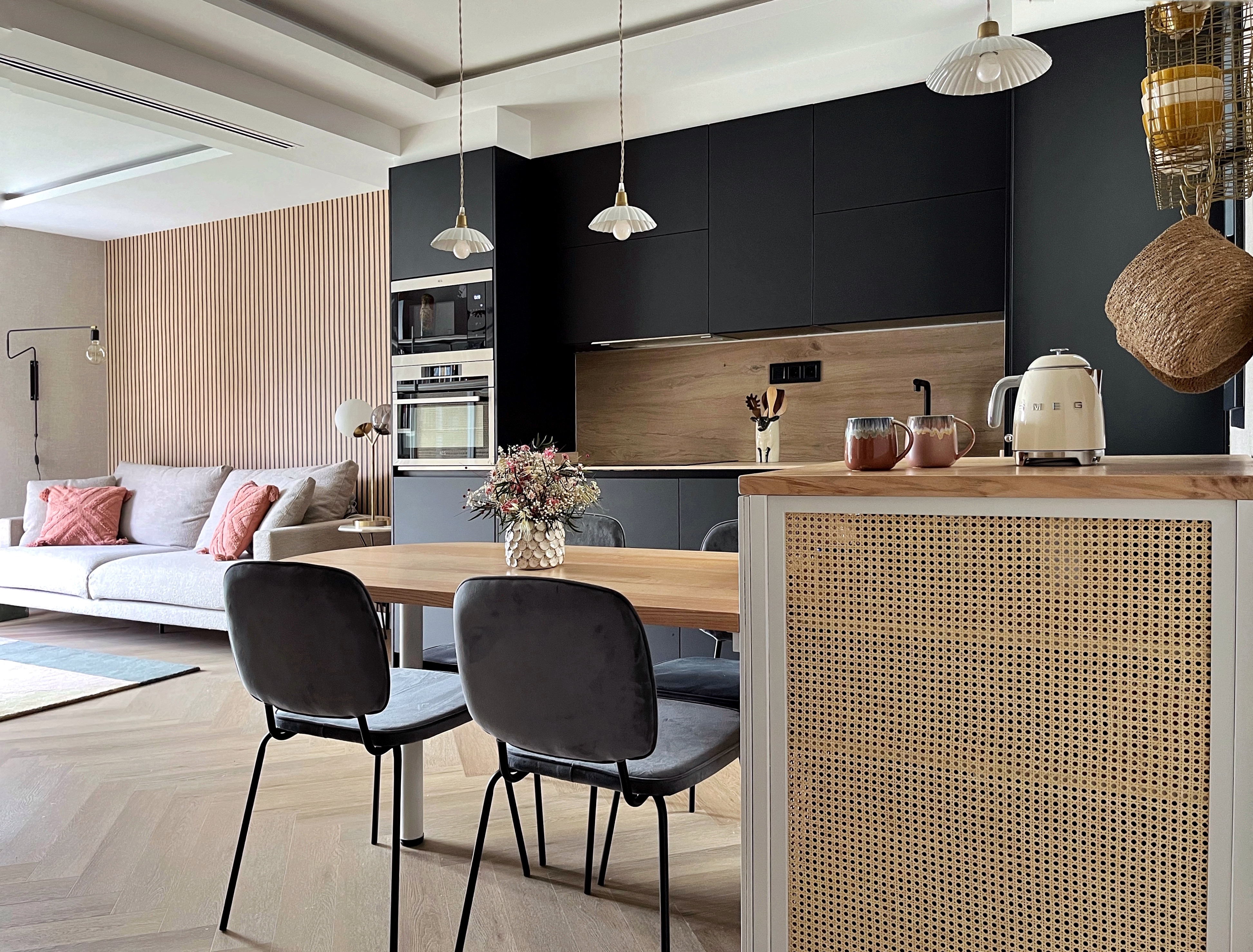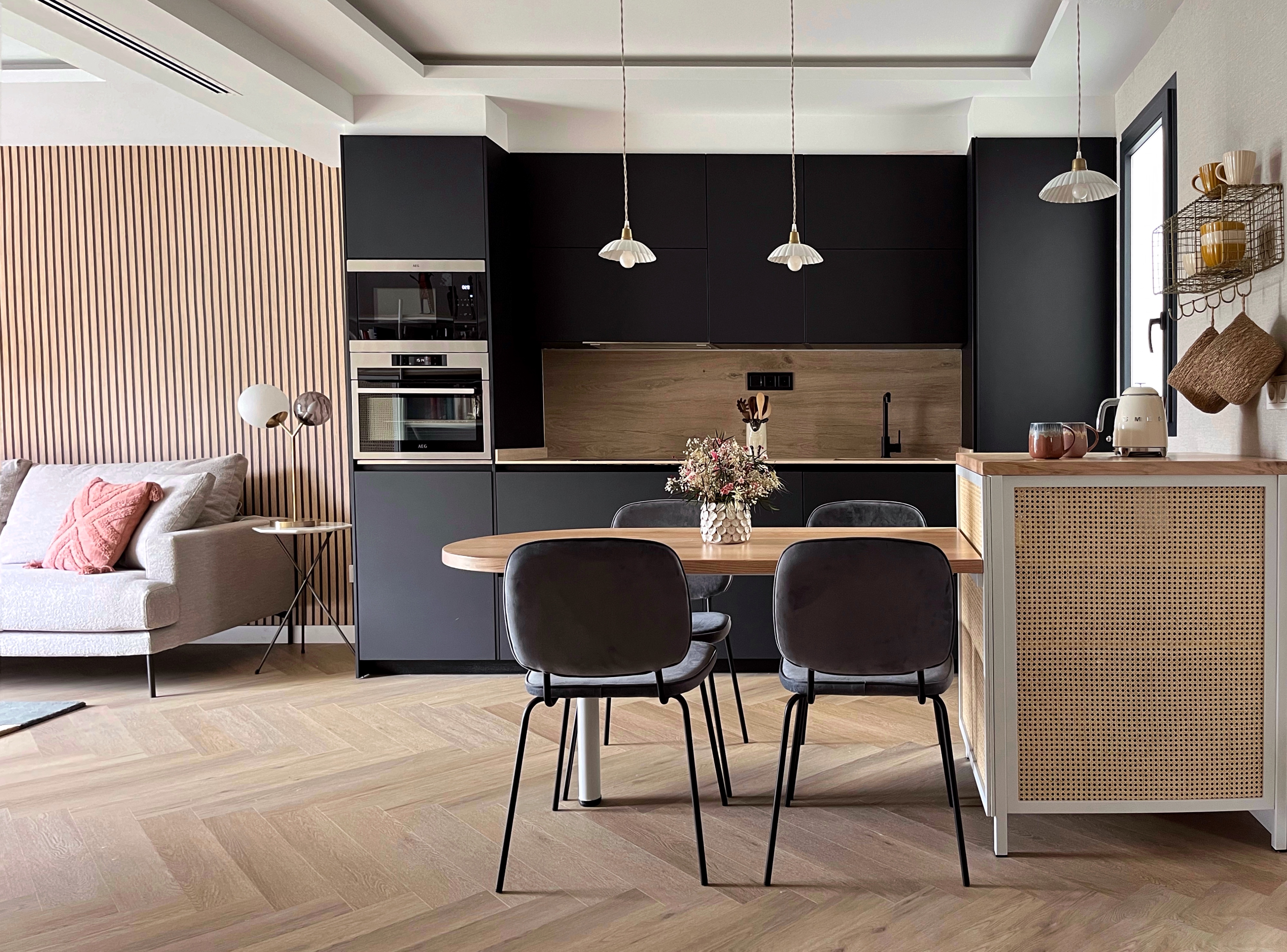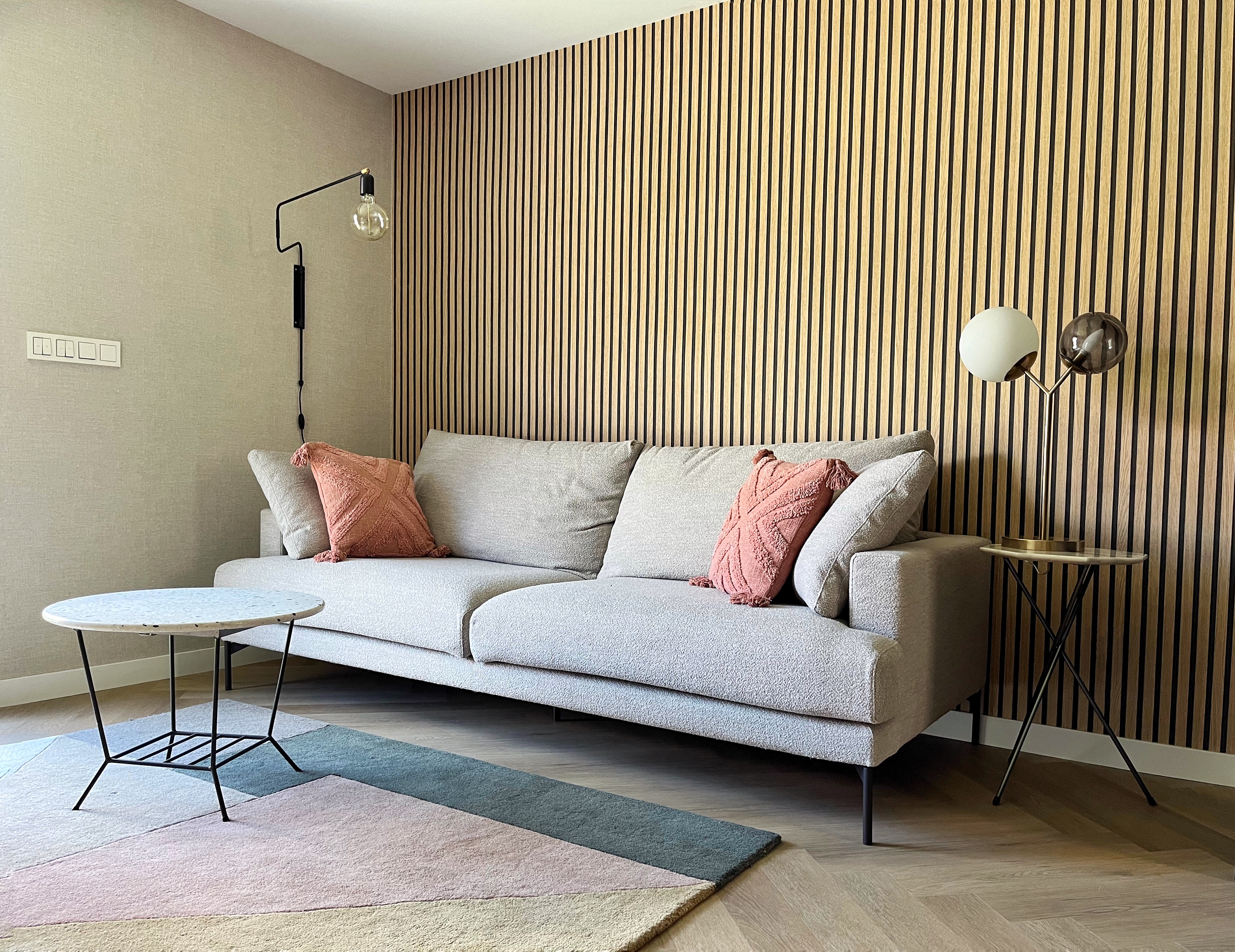 Este salón lo hemos diseñado en el estudio Batlló Concept y también hemos llevado a cabo el interiorismo del resto de la vivienda, perteneciente al proyecto [Miracruz]. Los muebles, excepto los de la cocina, han sido diseñados y fabricados en nuestro taller. Toda la equipación de la vivienda la hemos seleccionado y proporcionado desde nuestro estudio y la iluminación, decoración, menaje, accesorios de cocina y textil, es de nuestra tienda.
