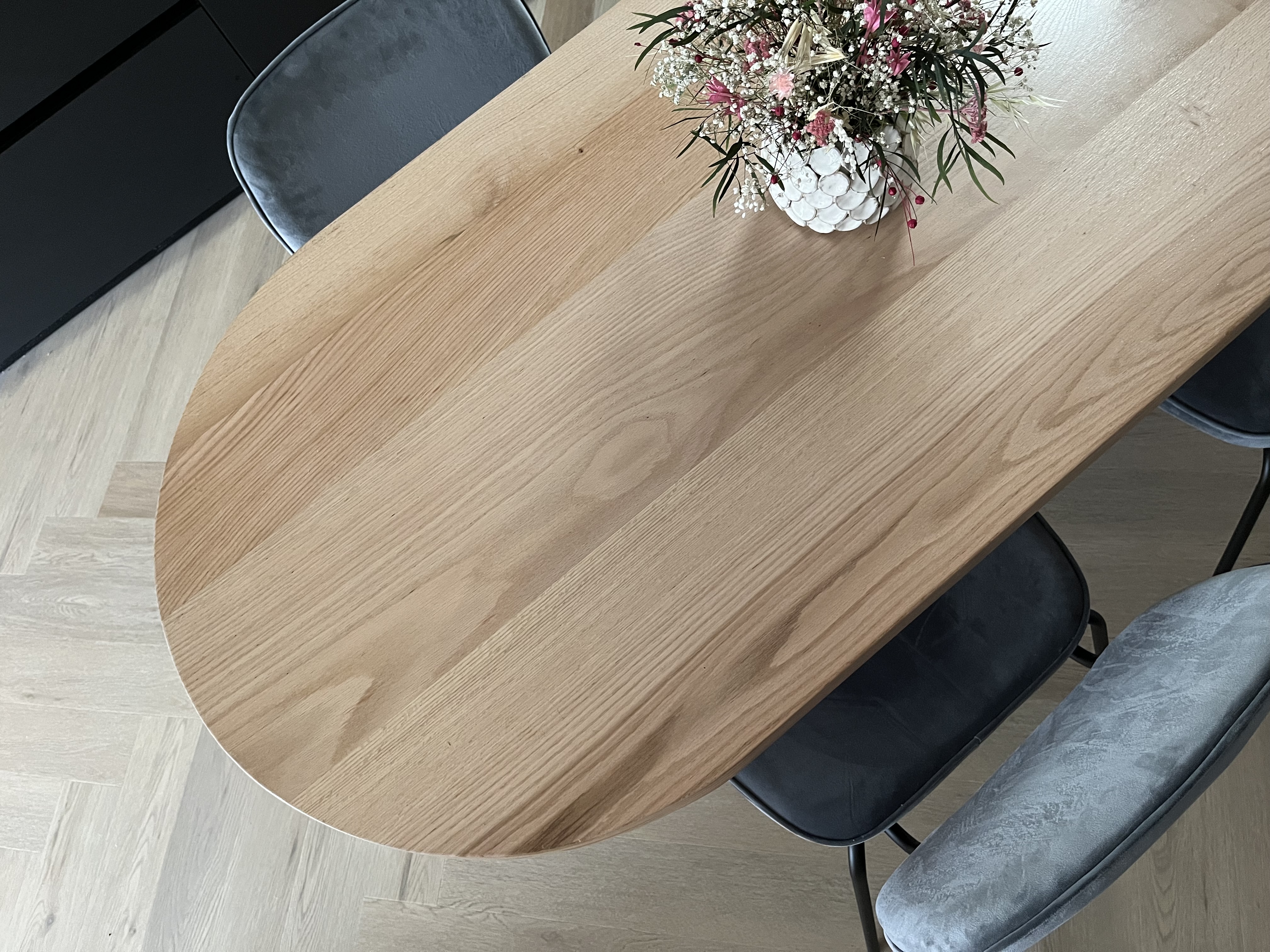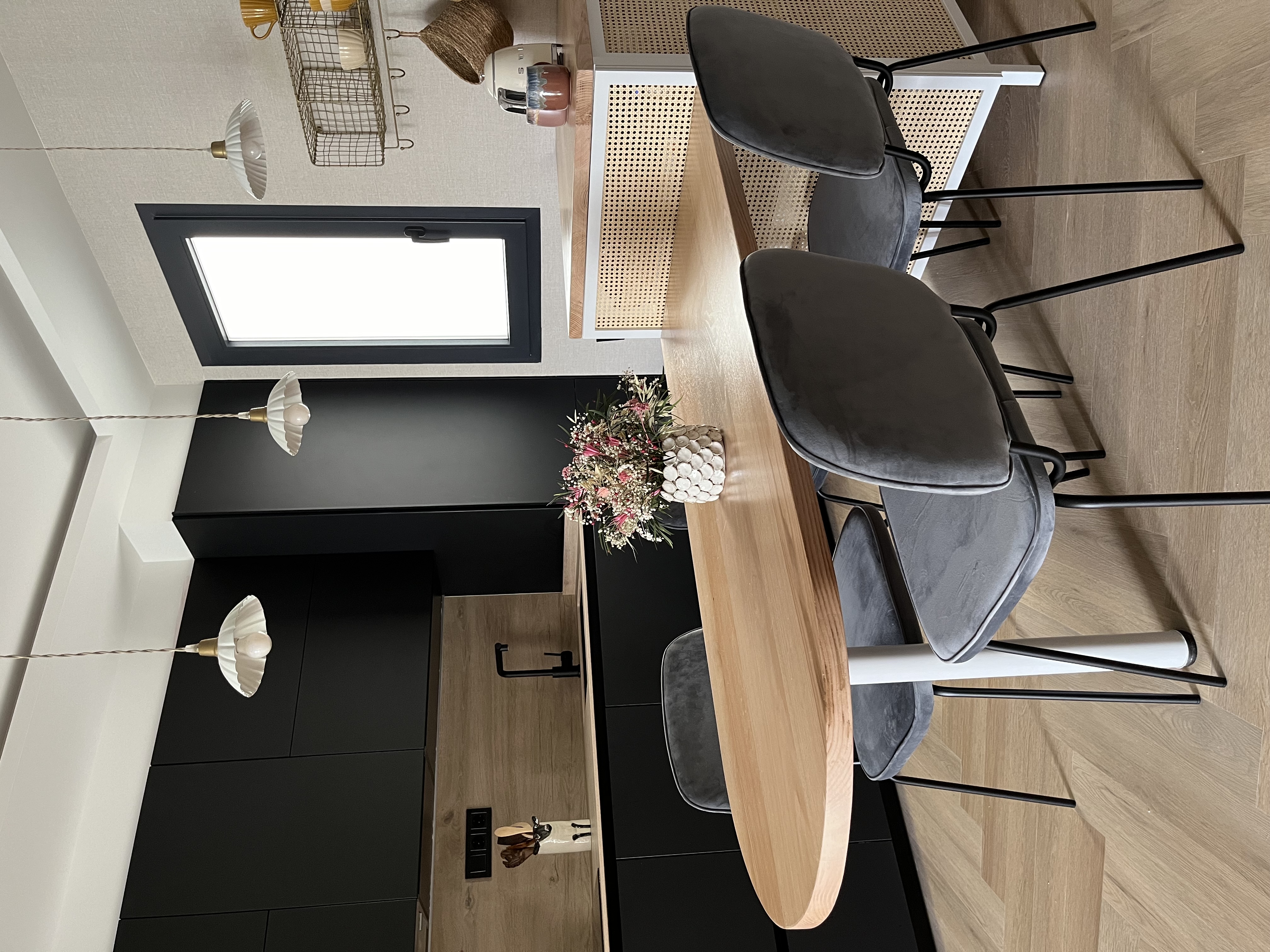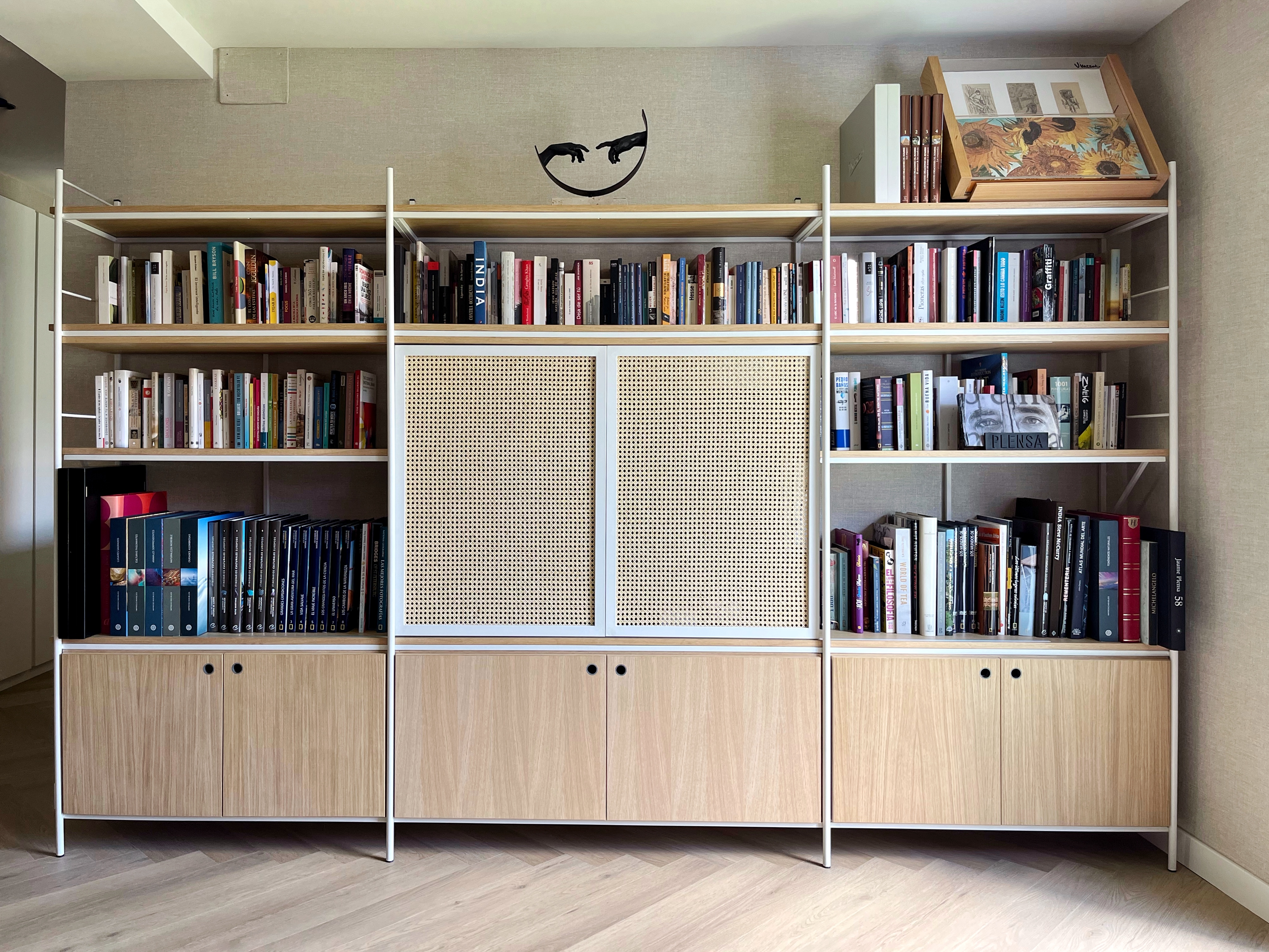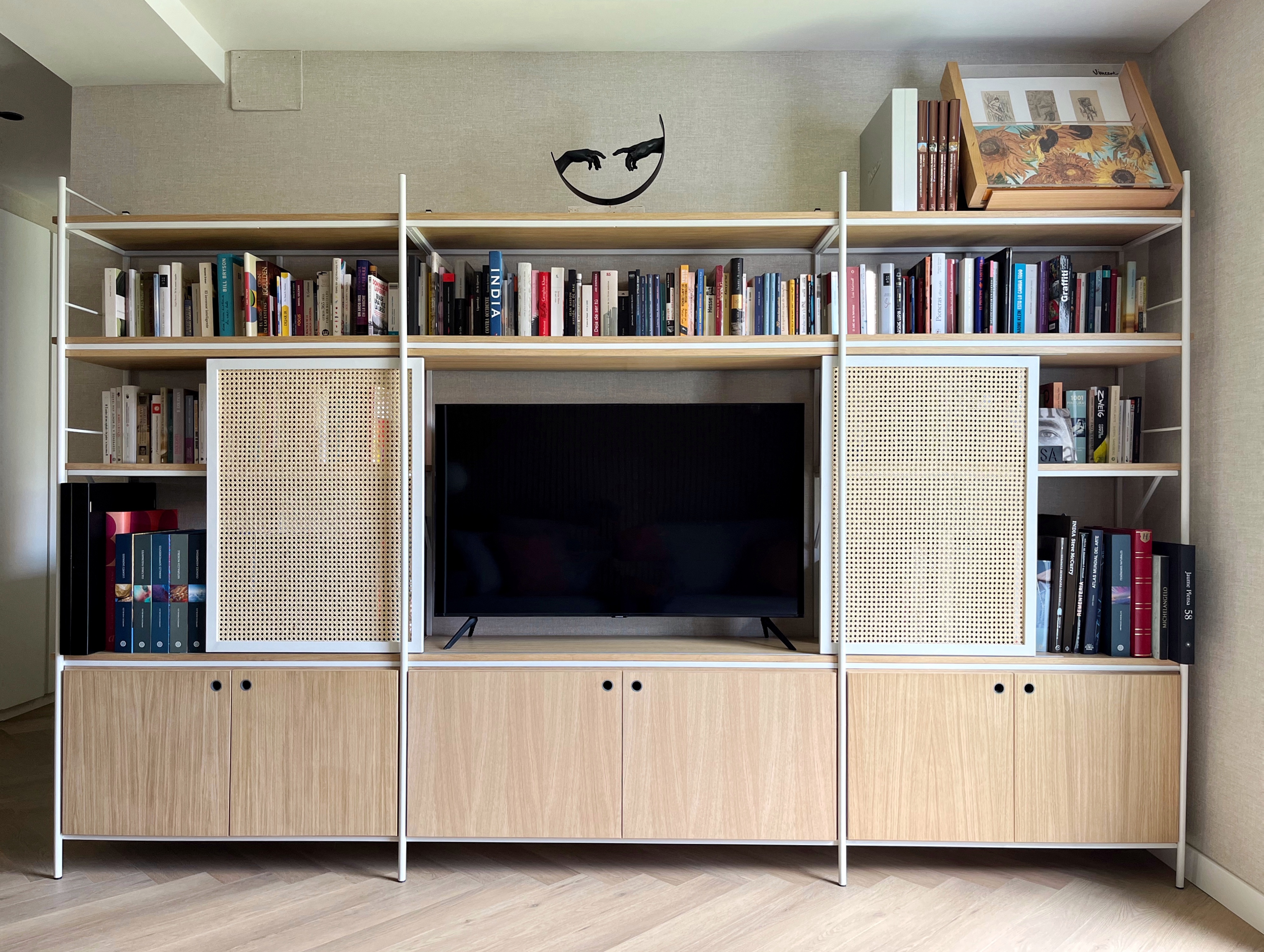 Nos encontramos en un espacio abierto en el que concurren hall, salón, pasillo y cocina/comedor. Para “separarlos”, diseñamos una mesa de trabajo con almacenaje seguida de una mesa de roble macizo con terminación ovalada. La clienta, amante de la lectura, quería que sus libros tuvieran protagonismo en el salón y quitárselo a la televisión. Por ello, diseñamos un mueble a medida con dos livianas puertas de rejilla de mimbre tras las que esconder la tele mientras ésta no fuese vista.