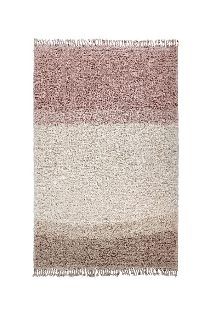 Sounds es una alfombra de lana natural lavable en lavadora, qued estaca por su original degradado de colores en tonos Dusty Pink, Natural y Champagne. La mezcla de colores elegantes y bohemios crean la pieza perfecta para dar armonía y color a cualquier espacio. Incluye una bolsa de algodón y una malla antideslizante.
