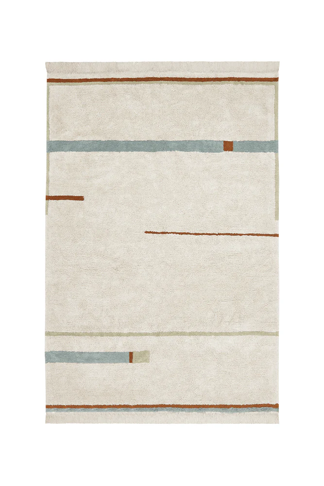 Una alfombra rectangular lavable inspirada en un patrón de calles anchas y estrechas. La alfombra juega con diferentes alturas de pelo, donde los más largos, en color Natural, contrastan con tiras de color, tejidas en pelo extra corto. Los bordes de la alfombra están rematados con flecos de color Natural. Esta alfombra está hecha a mano por artesanos con algodón 100% natural y tintes sin tóxicos. Se puede lavar a máquina y ademas puedes elegir entre dos medidas.