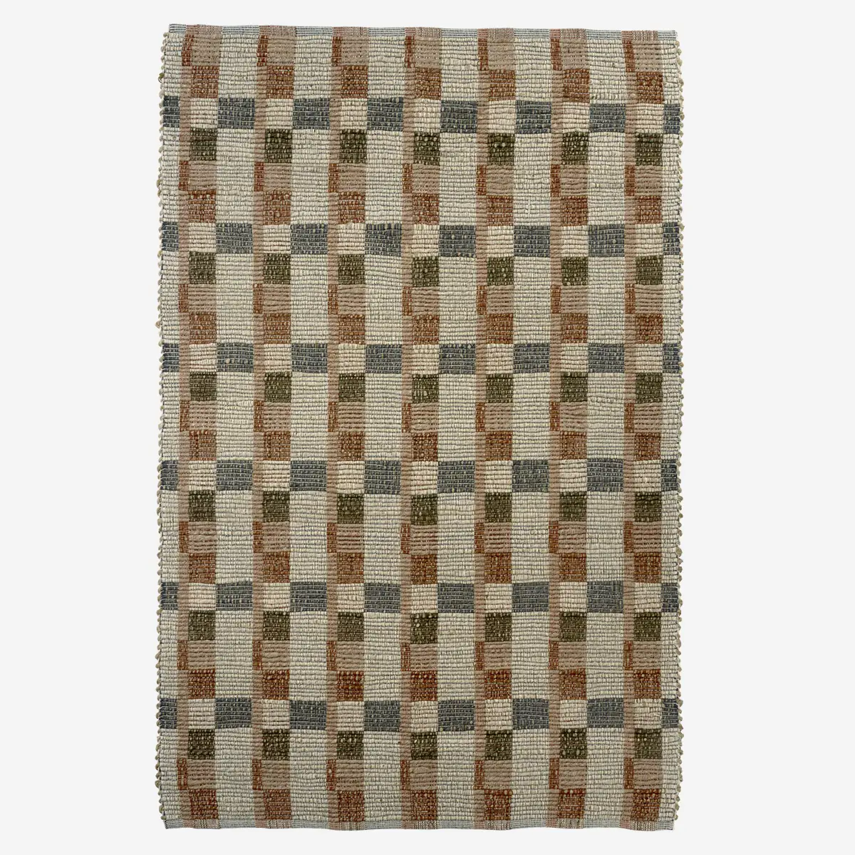La Alfombra Yute Cuadros esta tejida a mano y presenta tonos blanco, marron, verde oliva, azul oscuro y rosa antiguo en cuadros coordinados y texturas rústicas. Resistente y reversible, está diseñada para el uso diario, con sutiles referencias a los pliegues para aportar frescura a tu interior.
