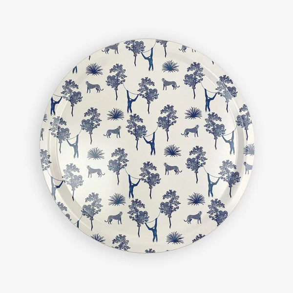 La bandeja redonda Jungla combina funcionalidad y estilo artístico. Adornada con un llamativo estampado tropical de monos, árboles y leopardos en tonos azul intenso, es tan práctica como decorativa. Gracias a su generoso tamaño, esta bandeja redonda es ideal para servir bebidas y aperitivos, o como espectacular centro de mesa para tus reuniones en casa.