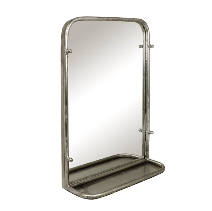 El Espejo con Estante Alba combina funcionalidad y encanto clásico en una pieza elegante de hierro y vidrio con acabado en plata antigua. Incluye una pequeña repisa ideal para frascos, maquillaje o decoración, y con ganchos laterales que aportan practicidad, el espejo pequeño tiene dos y el grande tres. Es perfecto para el baño, el recibidor o el dormitorio, añadiendo estilo y orden con un aire atemporal.