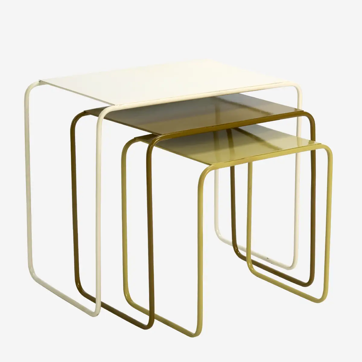 El Pack de Mesas Trio Nude es un conjunto de tres mesas auxiliares en tres colores delicados: Blanco crema, Verde aceituna y Amarillo limonada, tonos suaves y cálidos que aportan ligereza y calidez a tu espacio. Ideales para crear rincones acogedores, organizar tus objetos favoritos o acompañar tus momentos de relax, combinando estilo, sencillez y elegancia natural.
